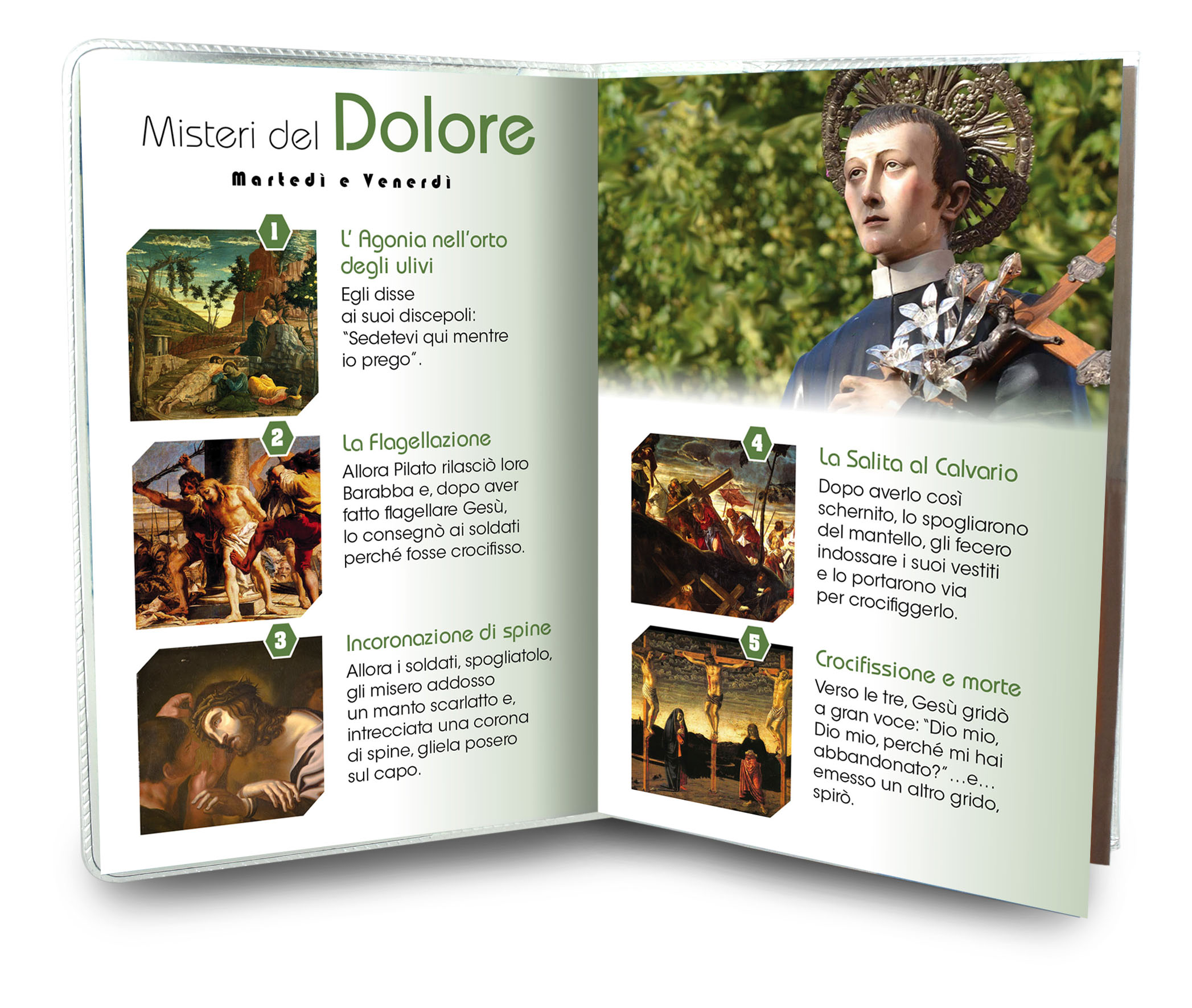 Il libretto, composto da 16 pagine, si presenta con una copertina in plastica trasparente e nell'interno vi è un piccolo rosario con i grani tipo perlina del diamero di mm 4.