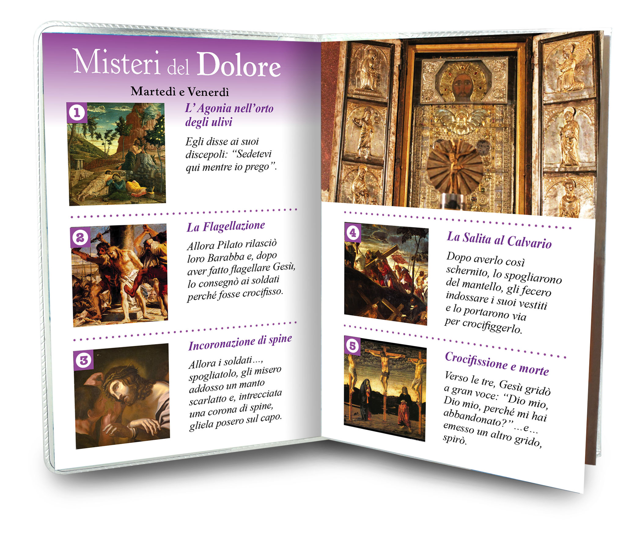 Il libretto, composto da 16 pagine, si presenta con una copertina in plastica trasparente e nell'interno vi è un piccolo rosario con i grani tipo perlina del diamero di mm 4.