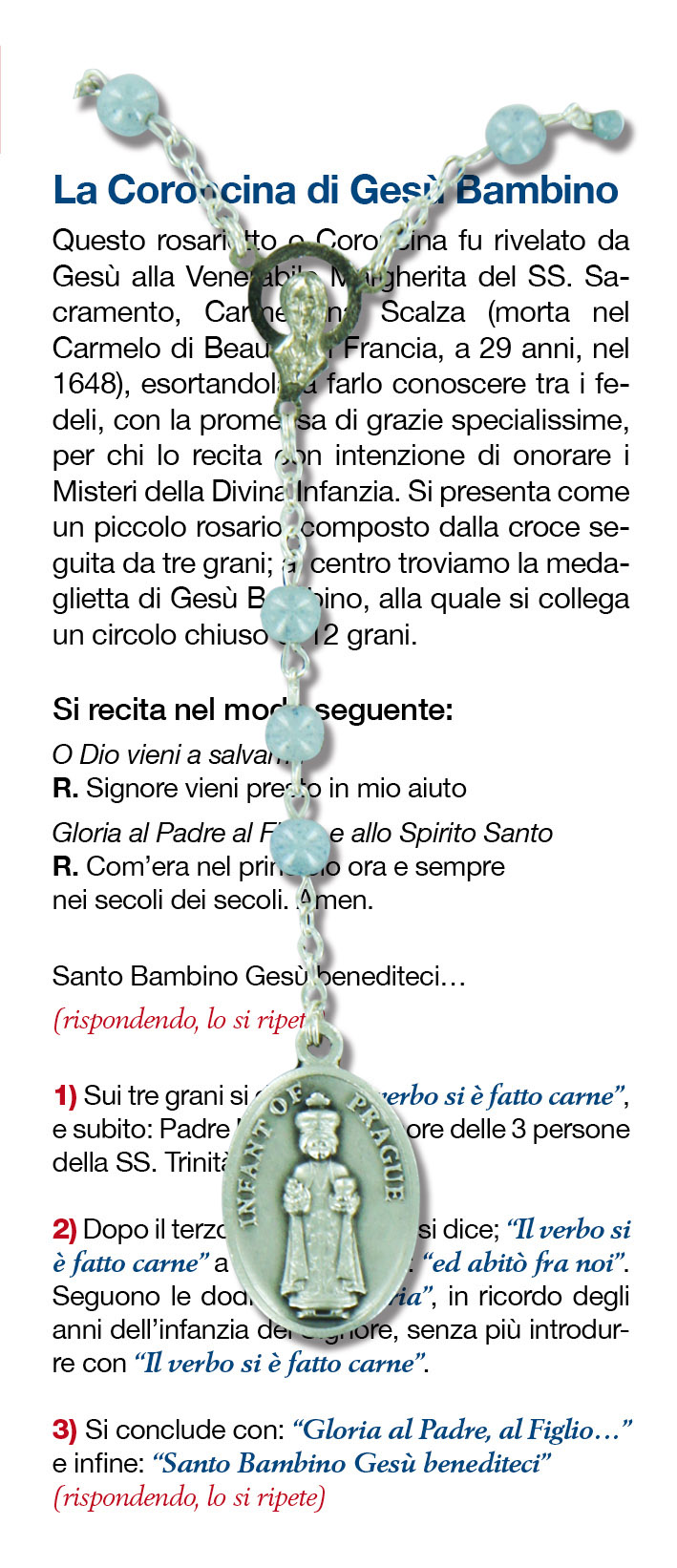 Nell'interno vi sono le invocazioni della novena dedicata a Gesù Bambino di Praga.