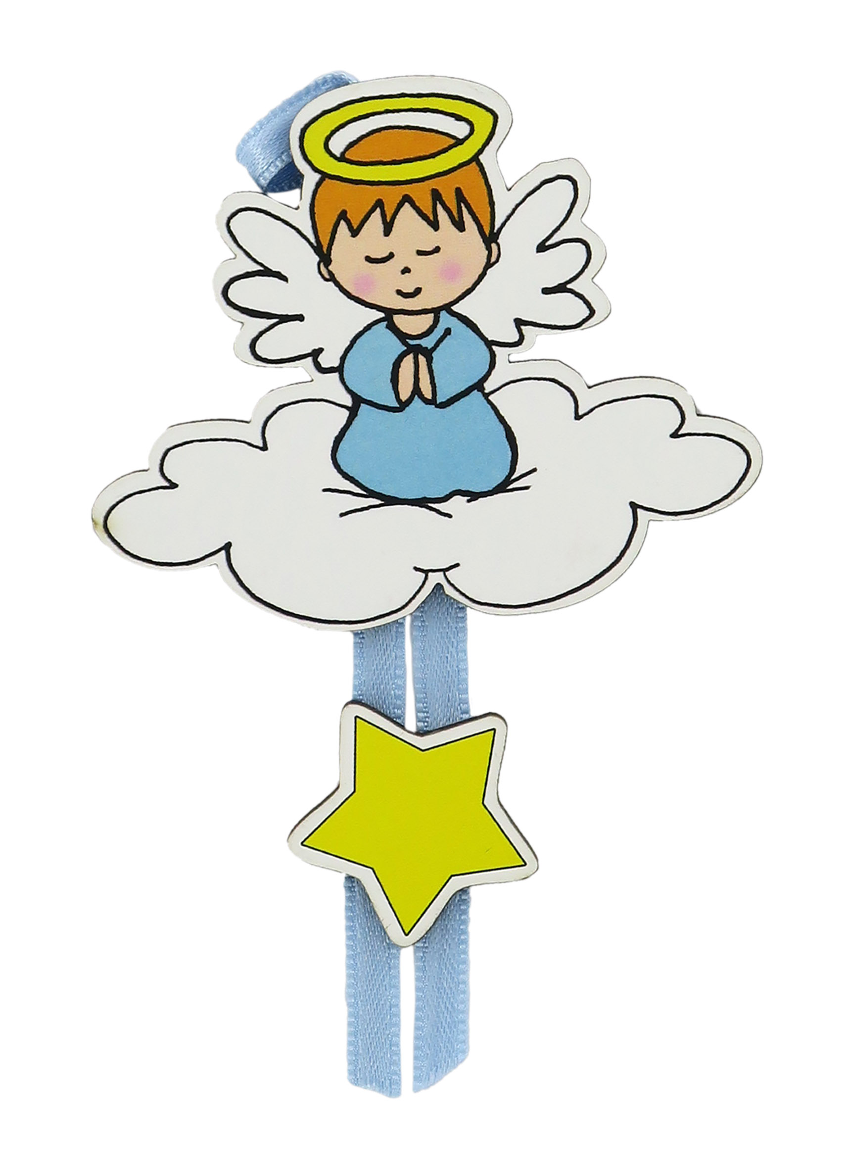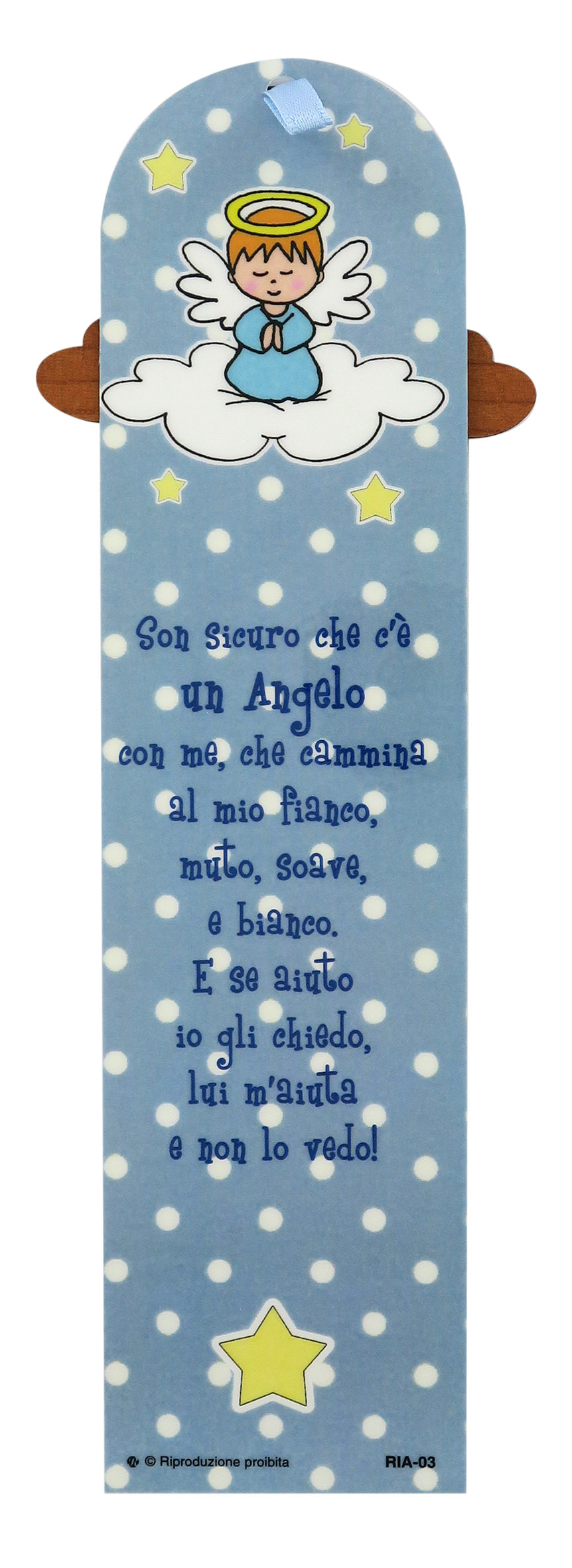 Segnalibro a forma di cupola con fiocchetto azzurro e immagine dell'angelo custode.