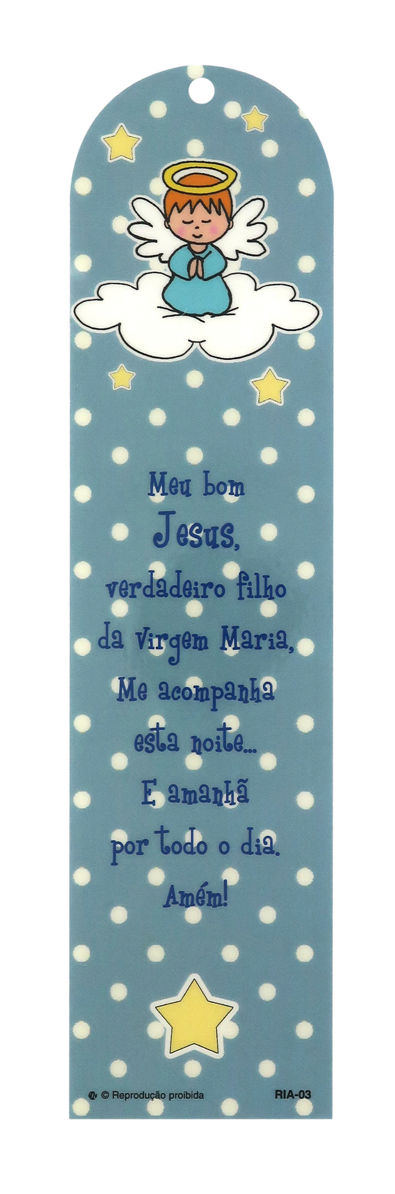 Segnalibro a forma di cupola con fiocchetto azzurro e immagine dell'angelo custode. preghiera in portoghese