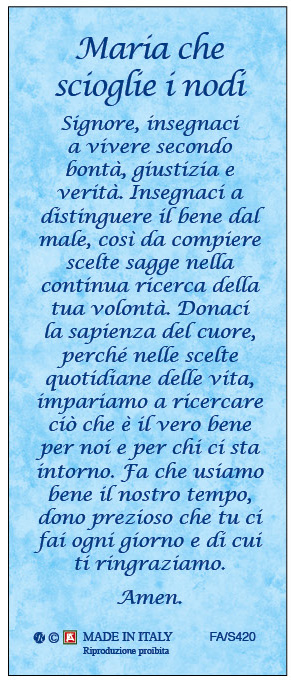 Segnalibro calamitato con l'immagine di Maria che scioglie i Nodi.