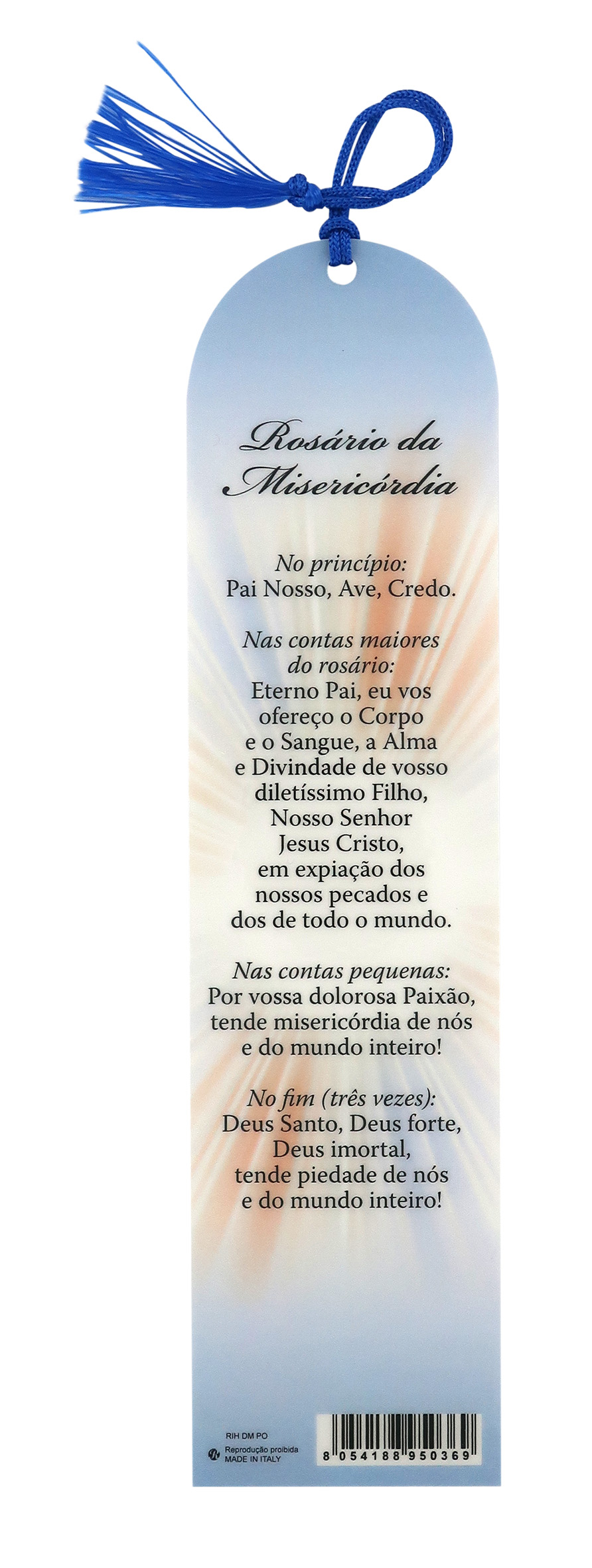 Segnalibro con parte superiore a forma di cupola, dedicato a Gesù Misericordioso (in portoghese: Jesus Misericordioso), con nappina di colore blu. La parte frontale reca un'immagine di Gesù, dal cui petto s'irradiano raggi color blu e rossi, simbolo del sangue e dell'acqua. Il retro offre una preghiera in portoghese.
