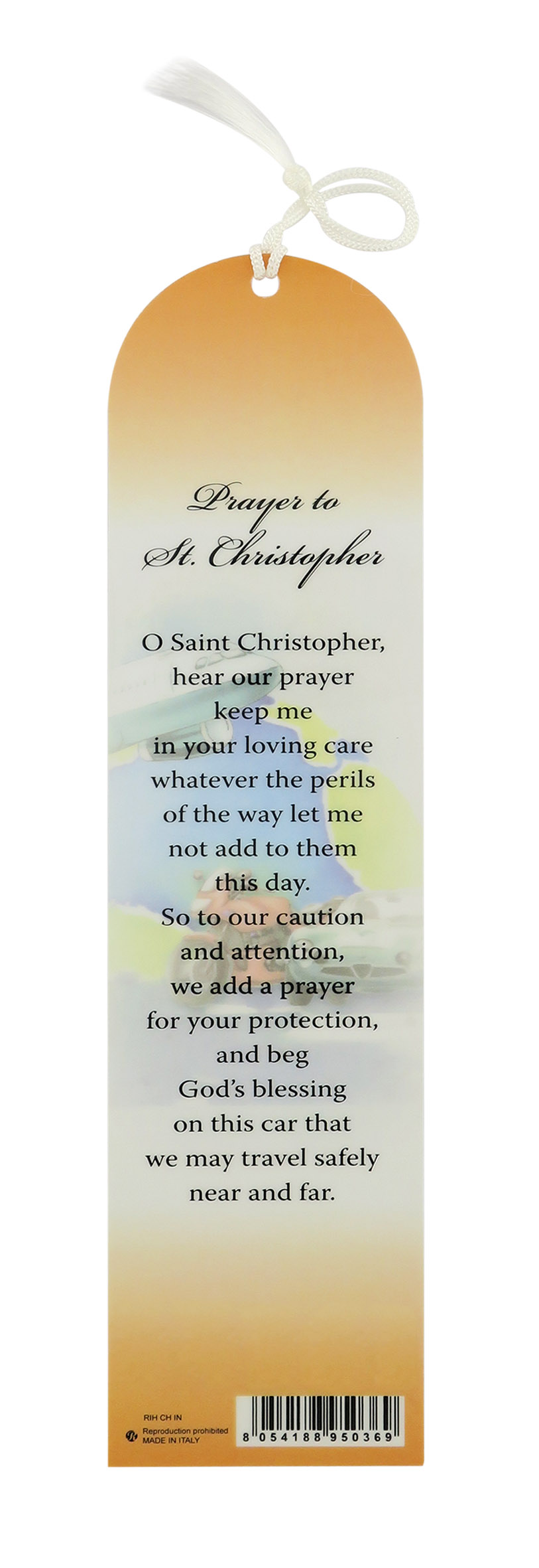 Segnalibro con parte superiore a forma di cupola, dedicato alla figura di San Cristoforo (in inglese: Saint Christopher), con nappina di colore bianco. La parte frontale reca un'immagine di S. Cristoforo come da iconografia: il santo guada un fiume aiutando il Bambino, trasportato sulle spalle, ad attraversare un corso d'acqua. Il retro offre una preghiera in inglese.