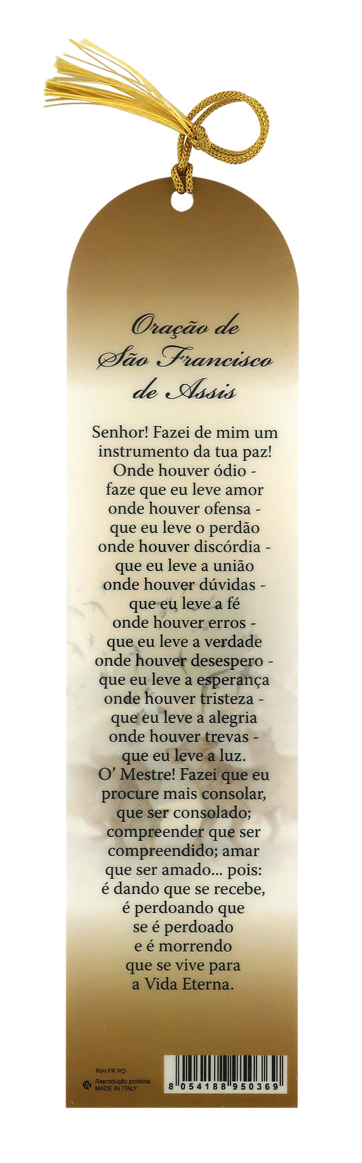 Segnalibro con parte superiore a forma di cupola, dedicato a San Francesco d'Assisi (in portoghese: São Francisco de Assis), con nappina di color senape. La parte frontale reca un'immagine del Santo di Assisi, immerso nella natura. In lontananza, il borgo umbro natìo. Il retro offre una preghiera in portoghese.