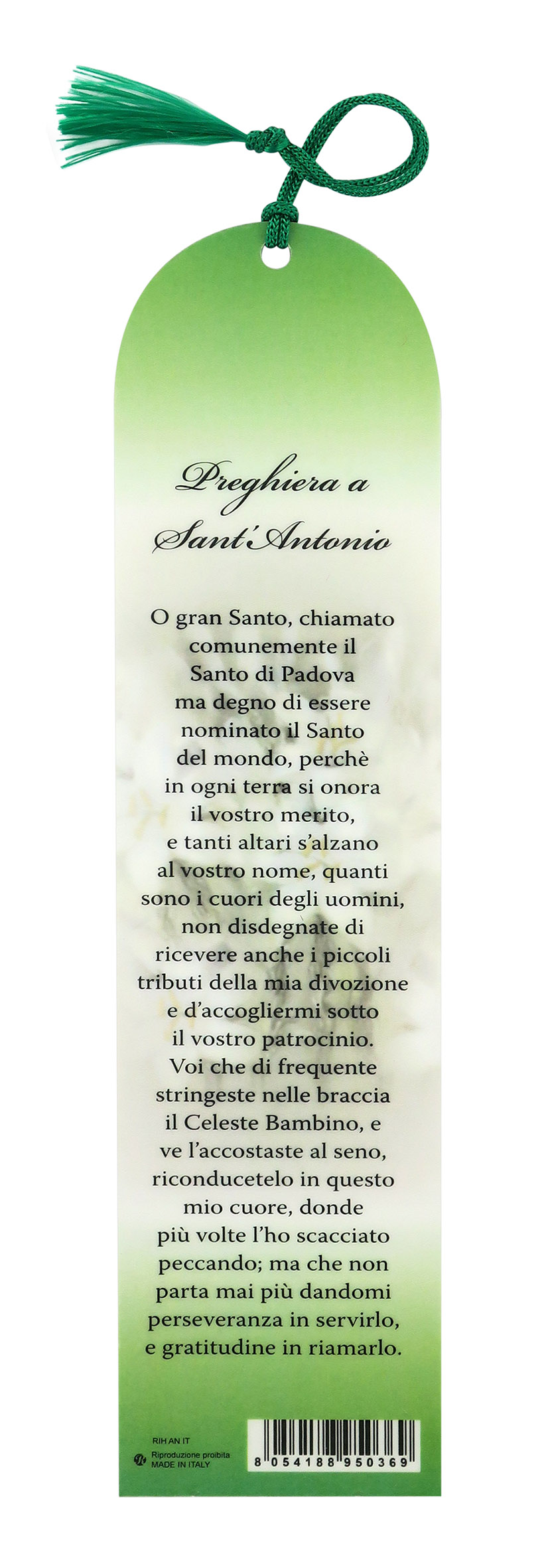 Segnalibro con parte superiore a forma di cupola, dedicato alla figura di Sant'Antonio, con nappina di colore verde. La parte frontale reca un'immagine in cui Sant'Antonio regge un bambino in braccio e i gigli. Il gesto di tenere in braccio il Bambin Gesù rappresenta l'attaccamento del Santo a Cristo e alla Fede, mentre i gigli sono simbolo di purezza e della lotta contro il male. Il retro offre una preghiera in italiano.