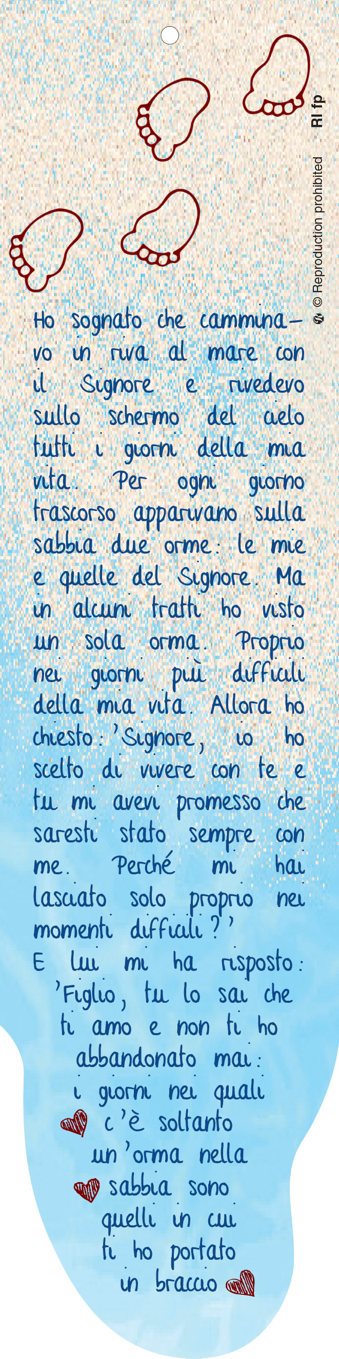 Segnalibro fustellato in PVC a forma di piede con preghiera in italiano.