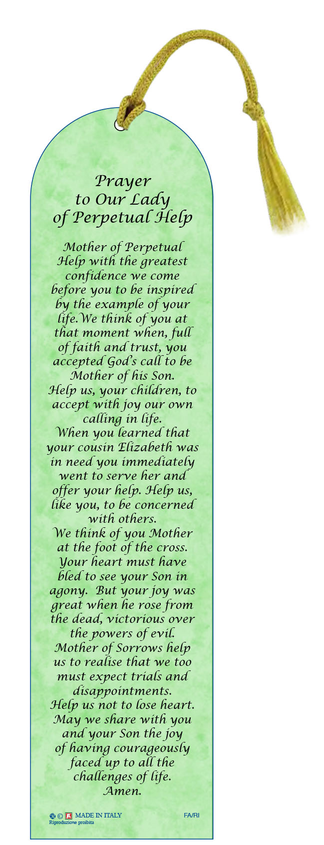 Segnalibro a forma di cupola con fiocchetto, raffigurante la Madonna del Perpetuo Soccorso (Lough Derg) con una preghiera in inglese.