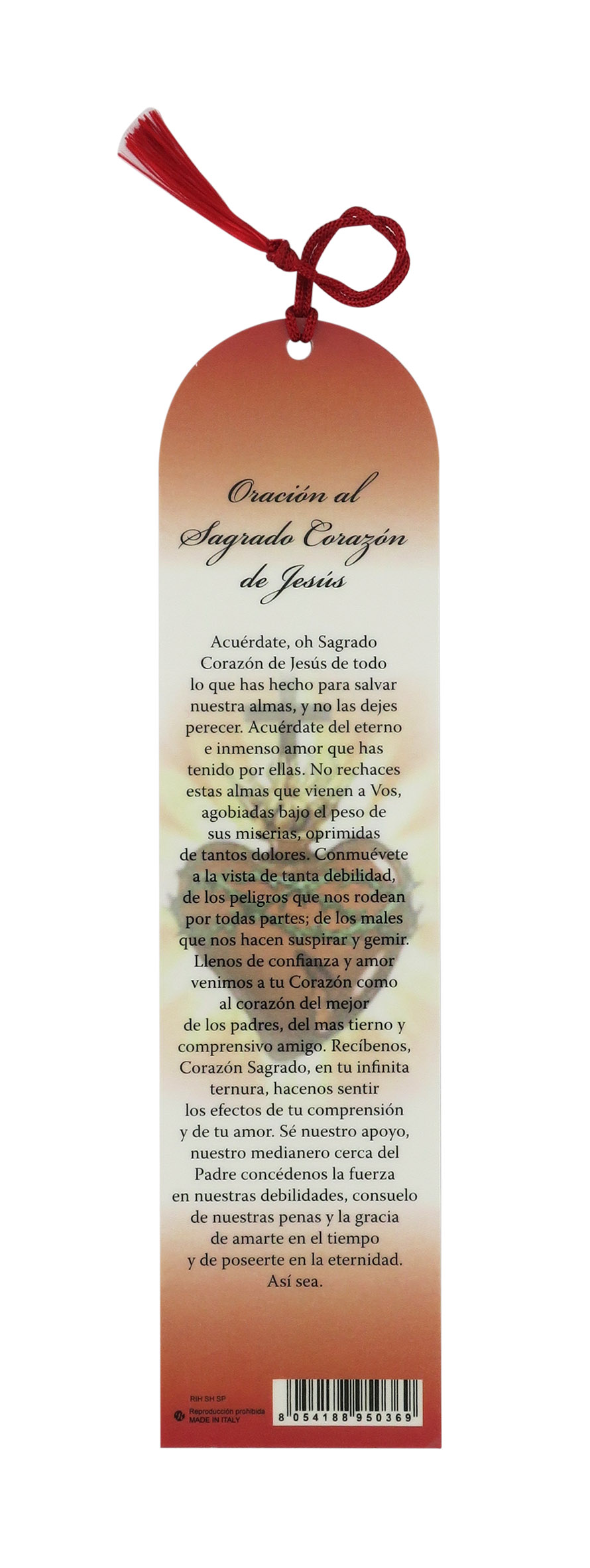 Segnalibro a forma di cupola con fiocchetto rosso e immagine del Sacro Cuore di Gesù e preghiera in spagnolo.