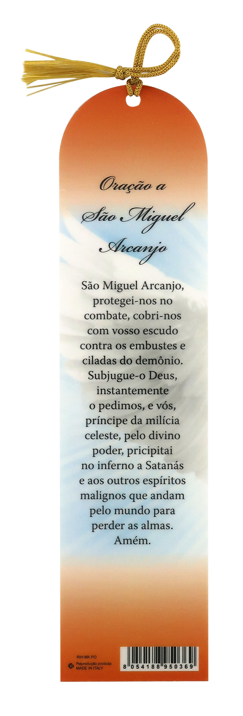 Segnalibro a forma di cupola con fiocchetto verde e immagine di San Michele e preghiera in portoghese