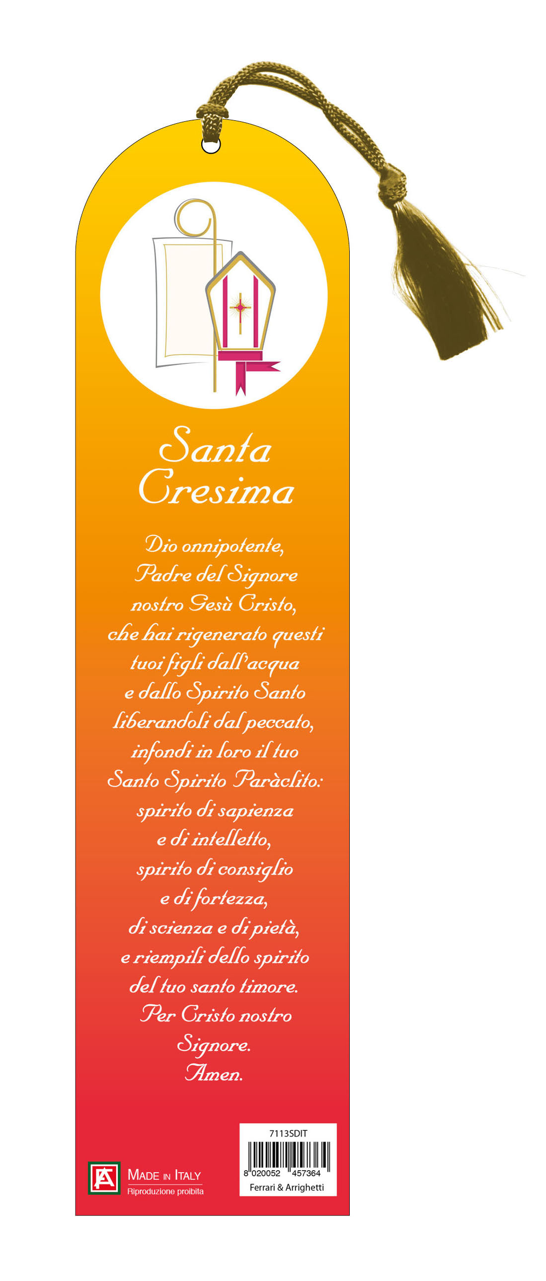 Segnalibro a forma di cupola con fiocchetto, raffigurante i simboli della cresima con prehiera in italiano.