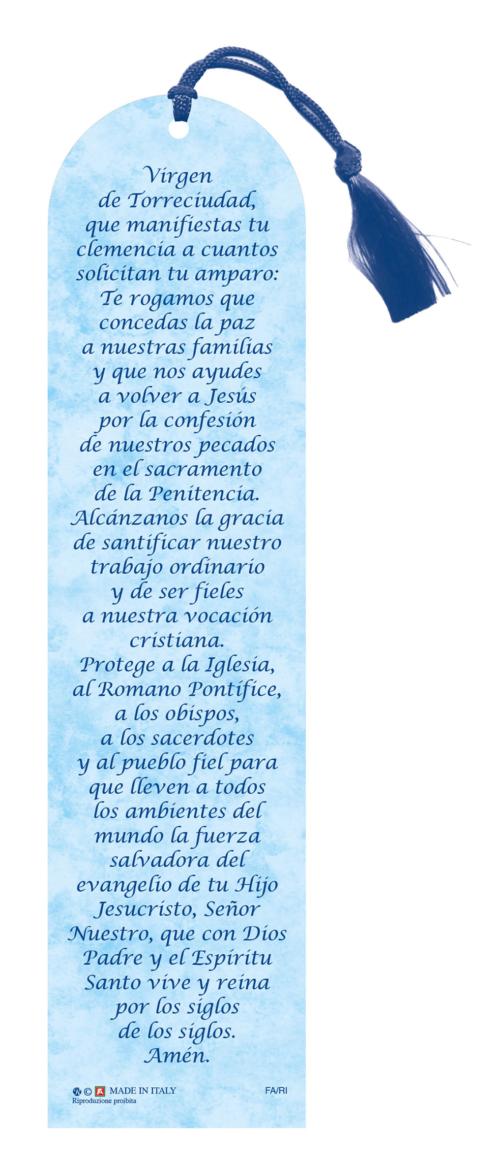 Segnalibro a forma di cupola con fiocchetto, raffigurante la Vergine di Torreciudad con prehiera in spagnolo.