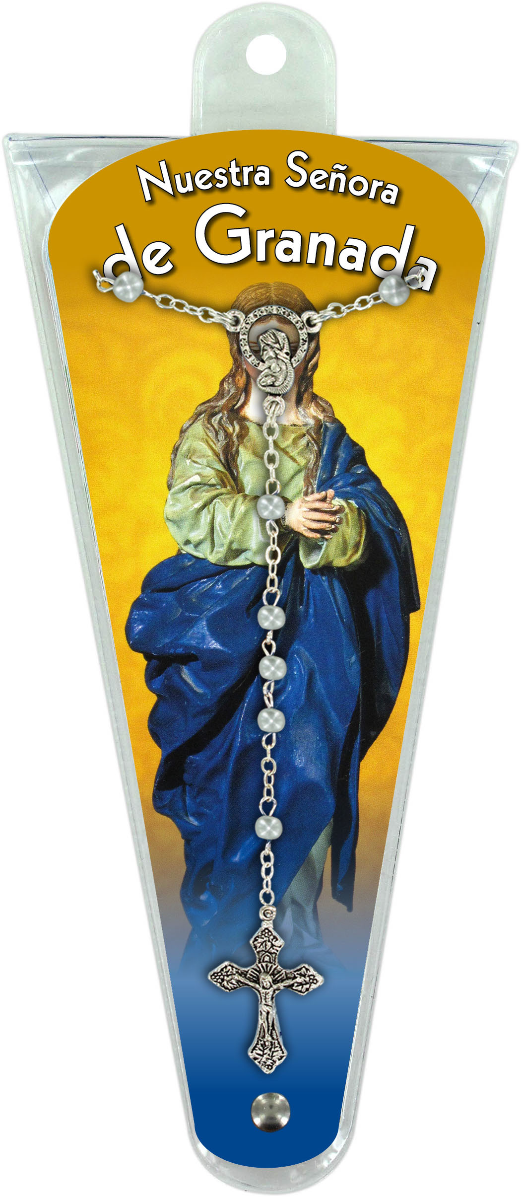 Ventaglio misteri del rosario Madonna della Cattedrale di Granada in spagnolo con rosario - altezza di 17,5 cm