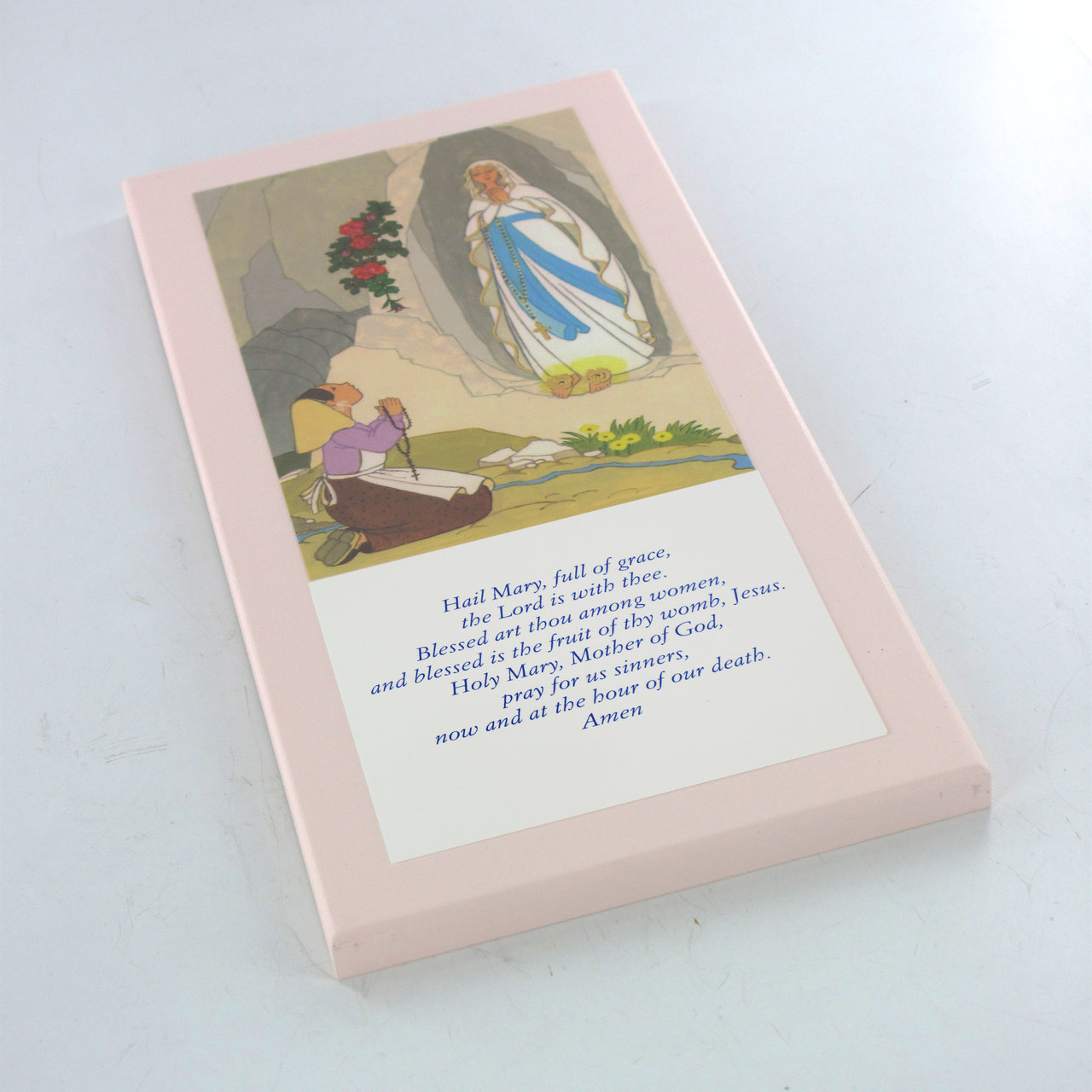 Tavola Lourdes con preghiera Ave Maria in inglese su legno rosa - 26 x 12,5 cm