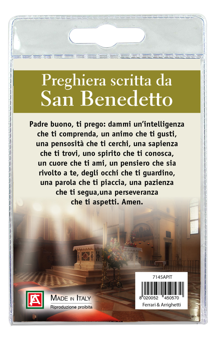 Nell'interno del blister c'è anche un cartoncino con l'immagine dell'Abbazia di Praglia (monastero benedettino) e sul retro del cartoncino stesso una preghiera scritta da San Benedetto.