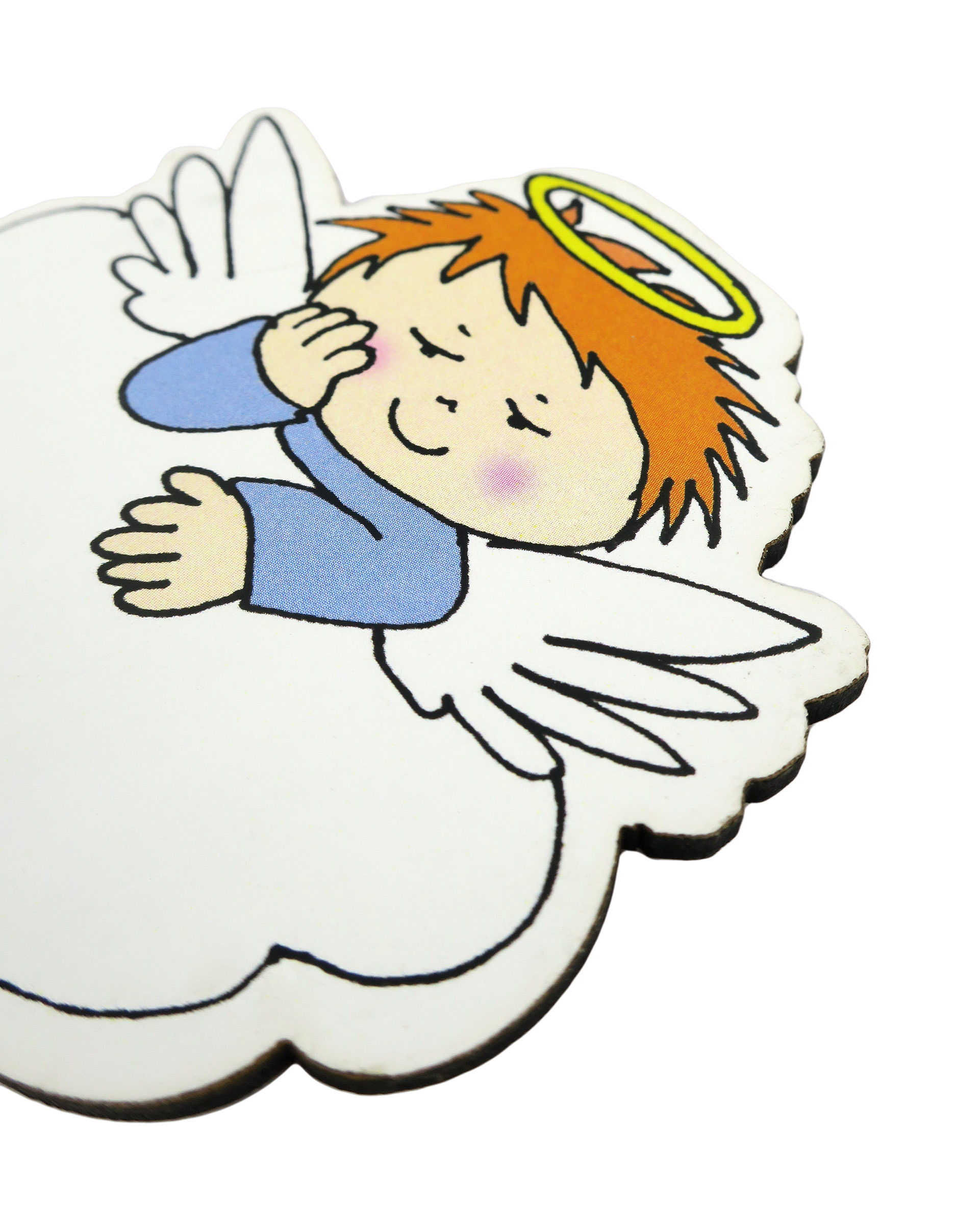 La calamita colorata è in legno mdf a forma di angelo custode.