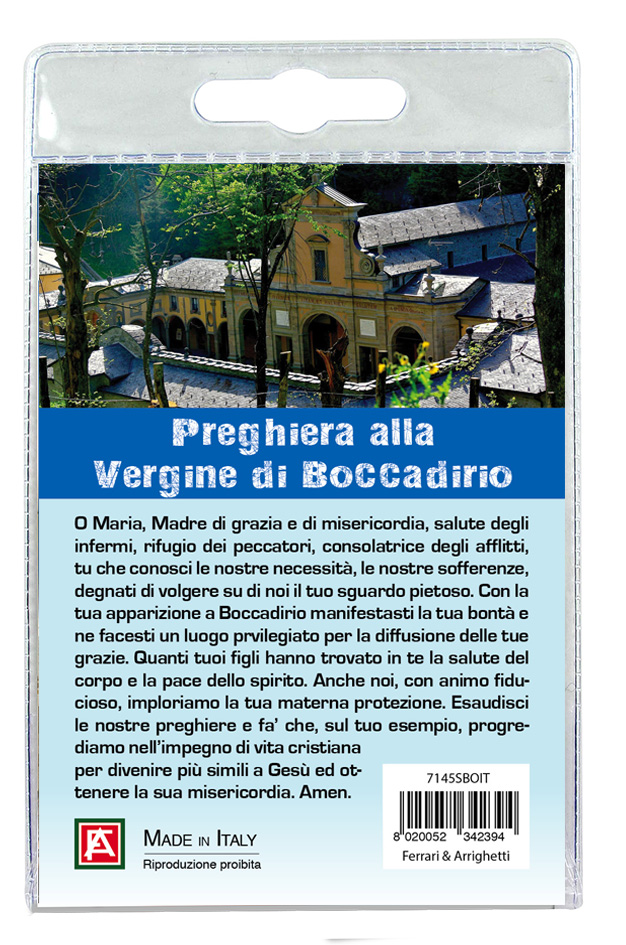 Nell'interno del blister c'è anche un cartoncino con l'immagine della Vergine e sul retro del cartoncino stesso una preghiera a lei dedicata.