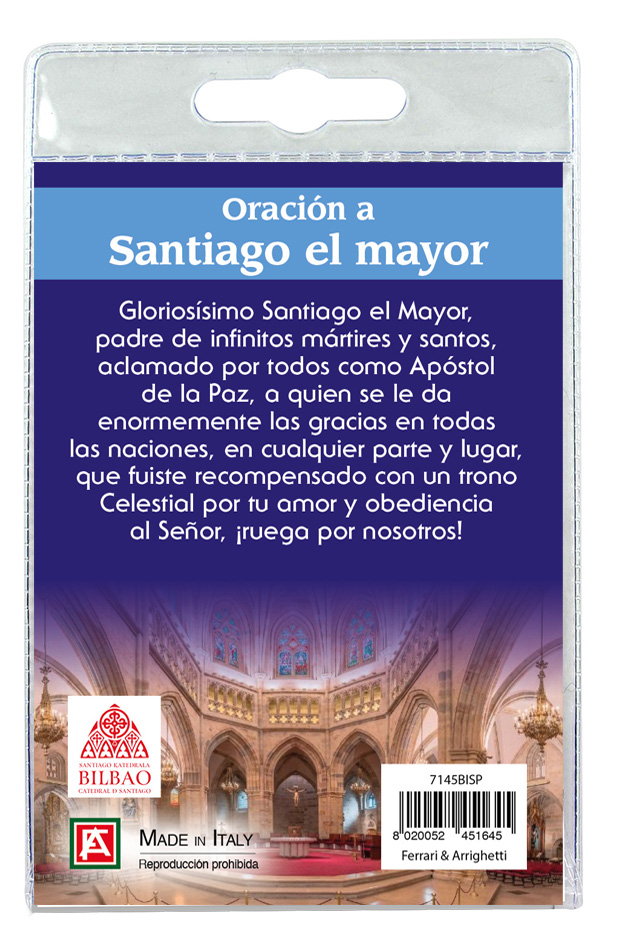 Calamita in metallo nichelato raffigurante la Catedral de Bilbao con una preghiera in spagnolo.