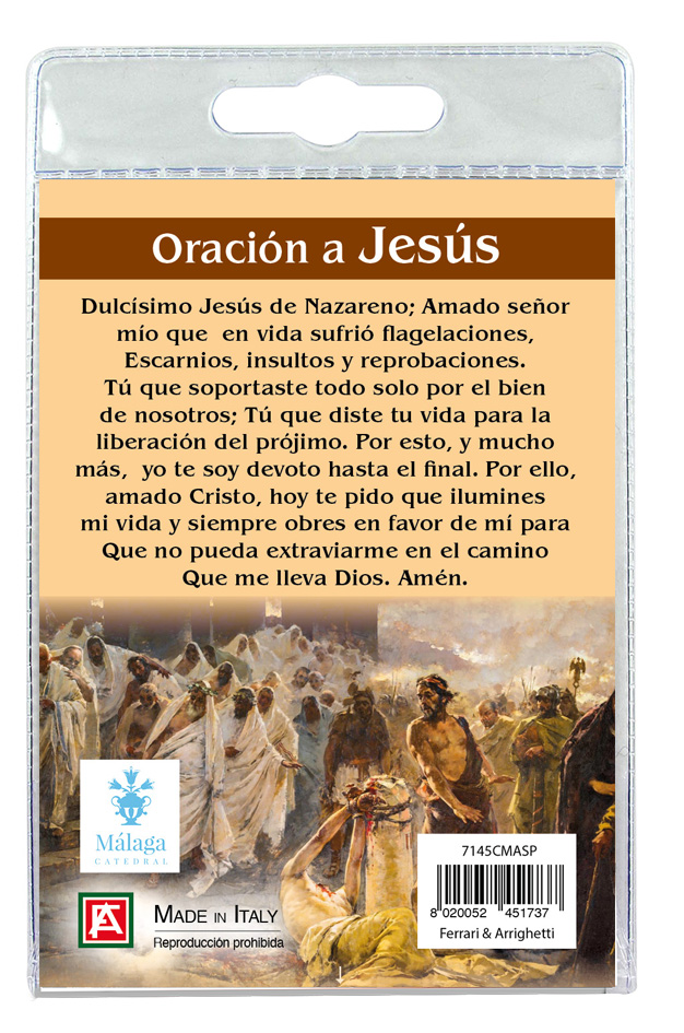 Calamita in metallo nichelato raffigurante la Catedral de Malaga con una preghiera in spagnolo.