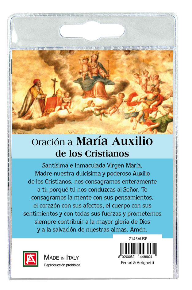 Calamita Madonna Ausiliatrice in metallo nichelato con preghiera in spagnolo