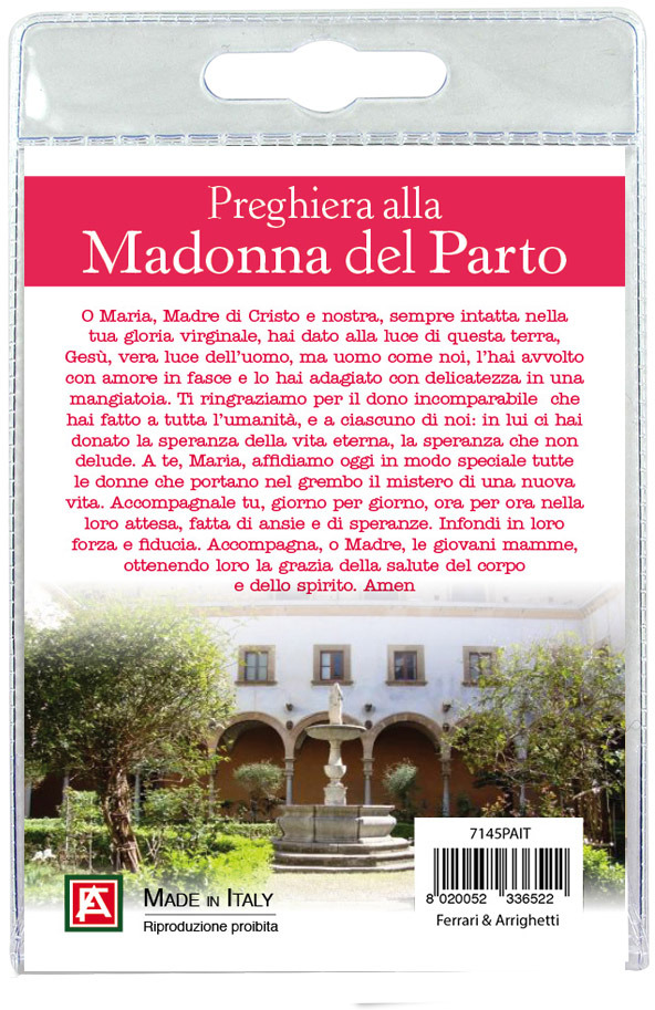 Nell'interno del blister c'è anche un cartoncino con l'immagine della Madonna e sul retro del cartoncino stesso una preghiera a lei dedicata.