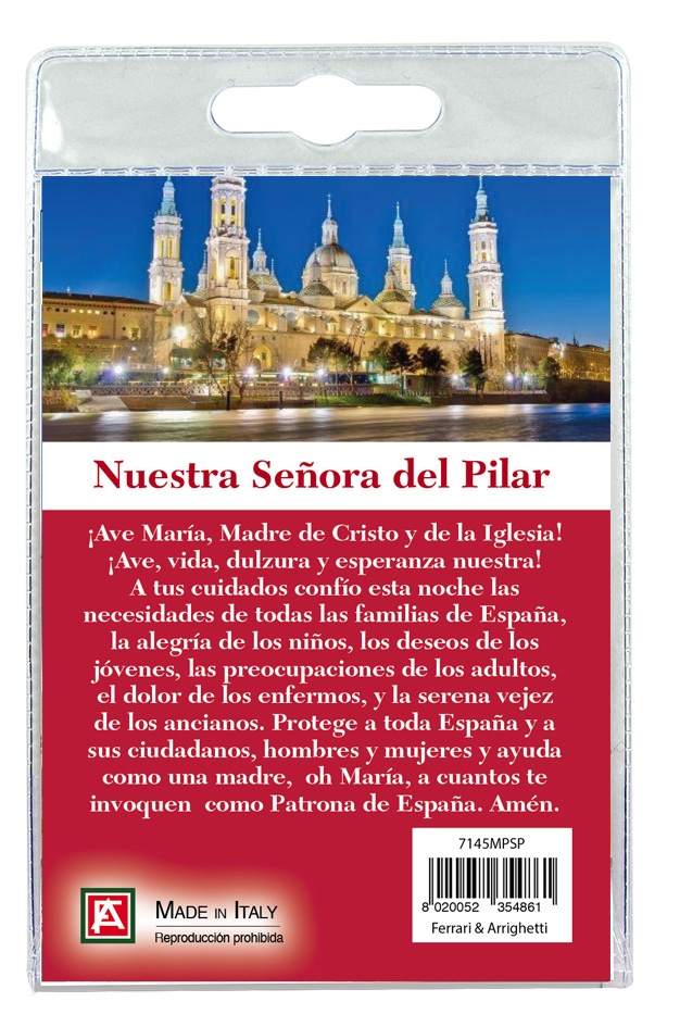 Calamita Madonna del Pilar in metallo nichelato con preghiera in spagnolo