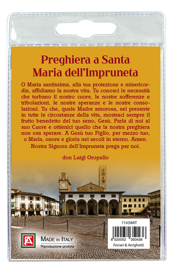 Nell'interno del blister c'è anche un cartoncino con l'immagine del Santuario e sul retro del cartoncino stesso una preghiera dedicata a Santa Maria dell'Impruneta.