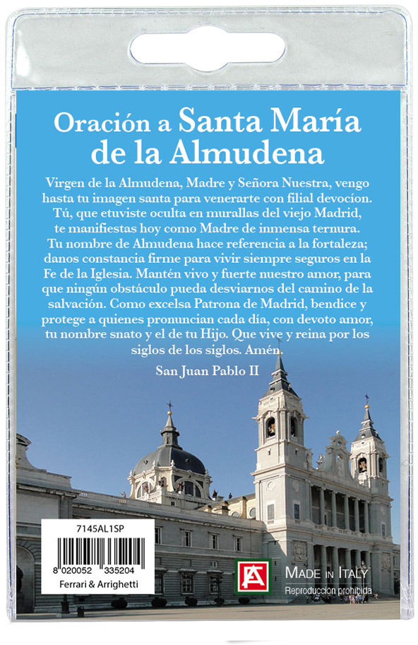Calamita Madonna di Almudena in metallo nichelato con preghiera in spagnolo