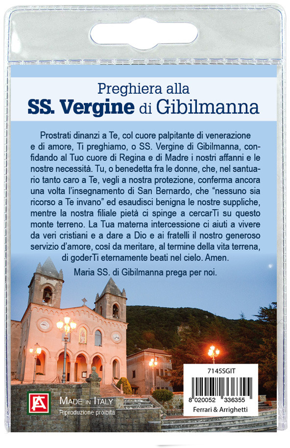 Calamita in metallo nichelato raffigurante la Madonna di Gibilmanna con preghiera in italiano.