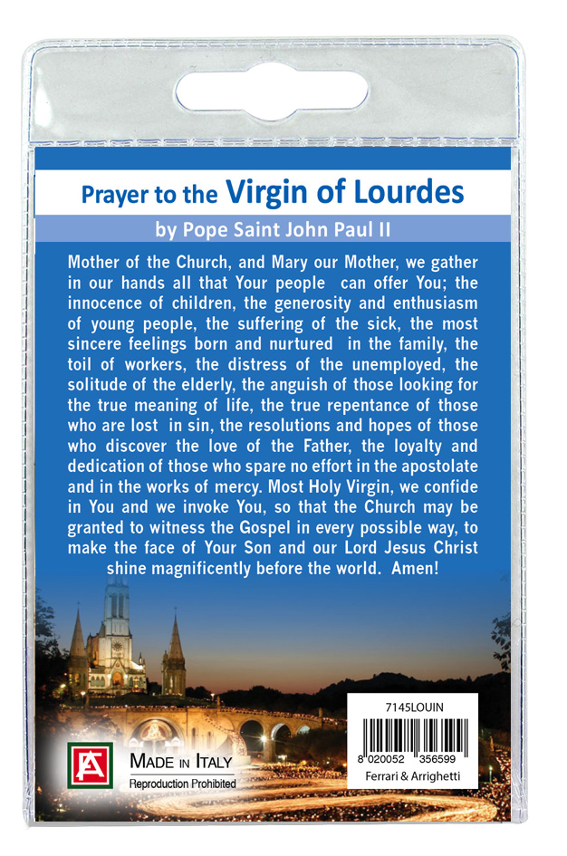 Nell'interno del blister c'è anche un cartoncino con l'immagine della Madonna e sul retro del cartoncino stesso una preghiera a lei dedicata.