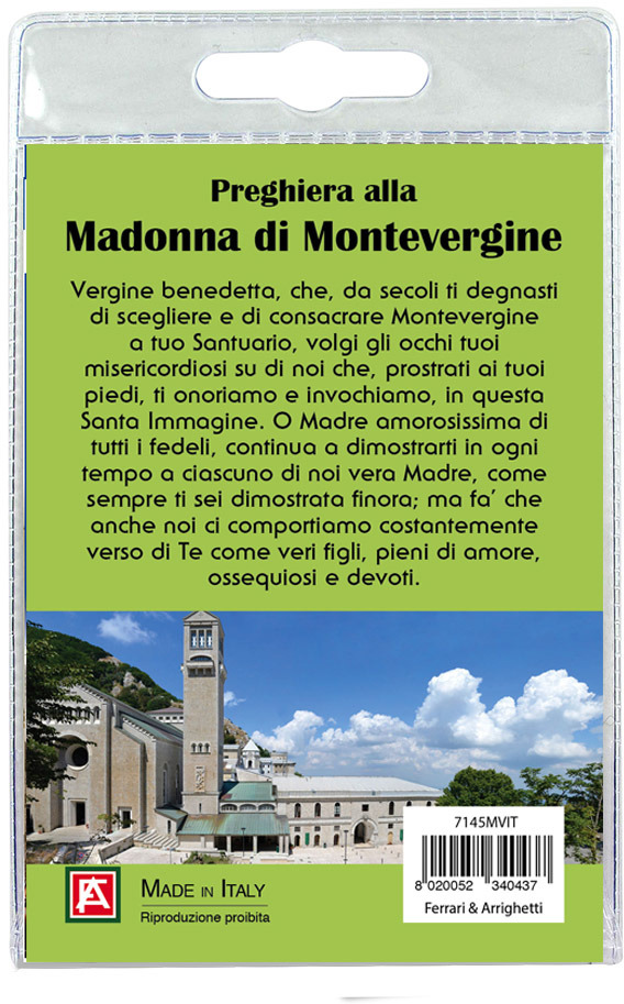 Nell'interno del blister c'è anche un cartoncino con l'immagine della Madonna e sul retro del cartoncino stesso una preghiera a lei dedicata.