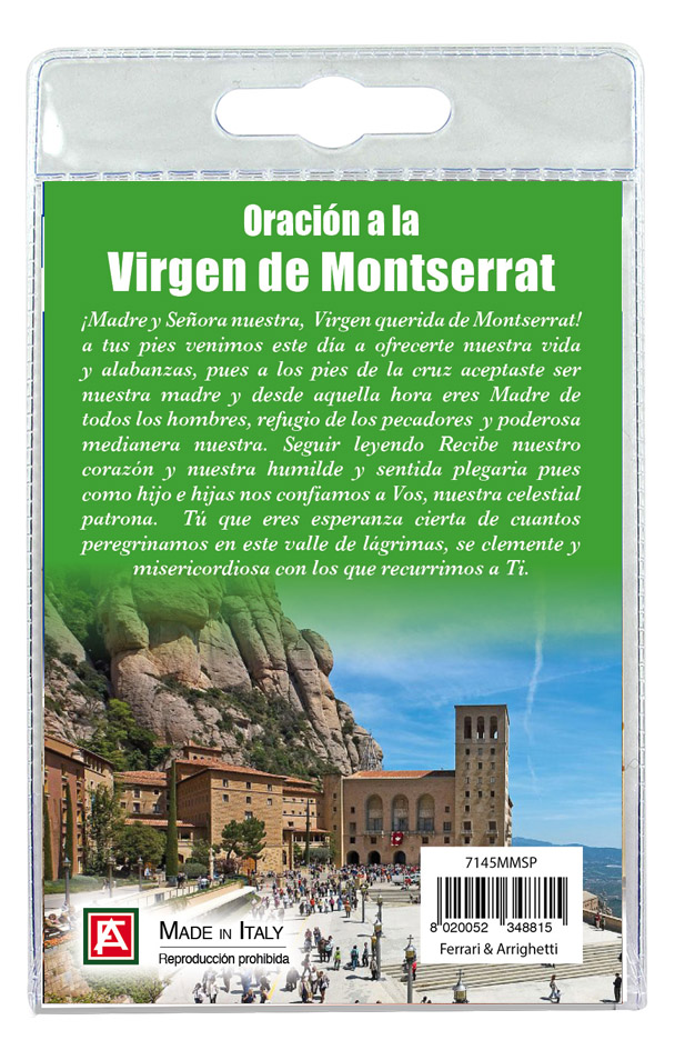 Calamita Madonna di Montserrat in metallo nichelato con preghiera in spagnolo