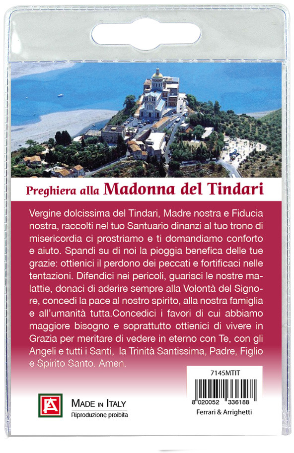 Calamita Madonna di Tindari in metallo nichelato con preghiera in italiano