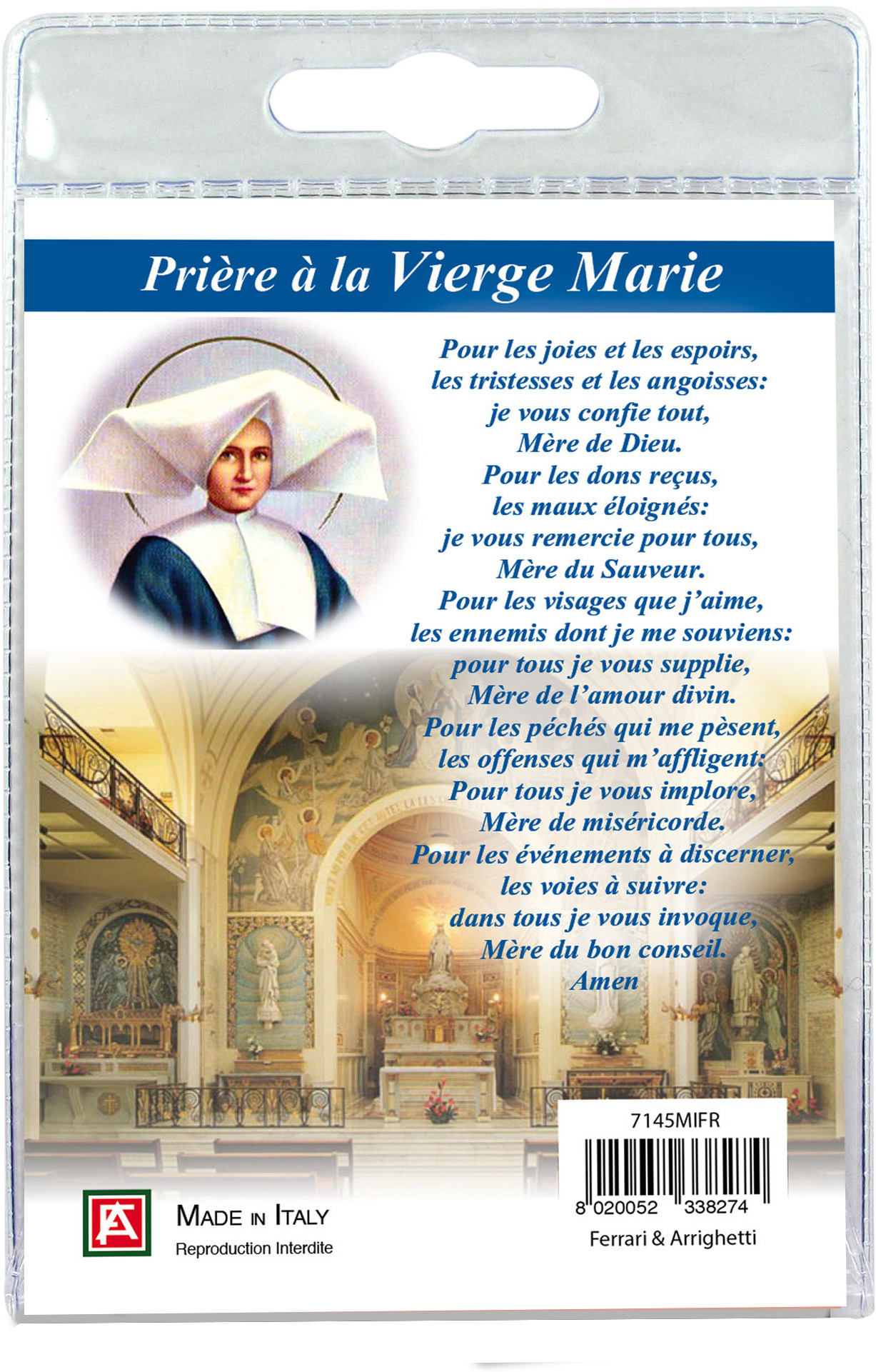 Nell'interno del blister c'è anche un cartoncino con l'immagine della Madonna e sul retro del cartoncino stesso una preghiera a lei dedicata.