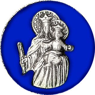 Calamita con forma ottagonale, in metallo nichelato con smalto blu che circonda la placchetta in metallo, raffigurante Maria Ausiliatrice. La misura della calamita è di 4 cm.