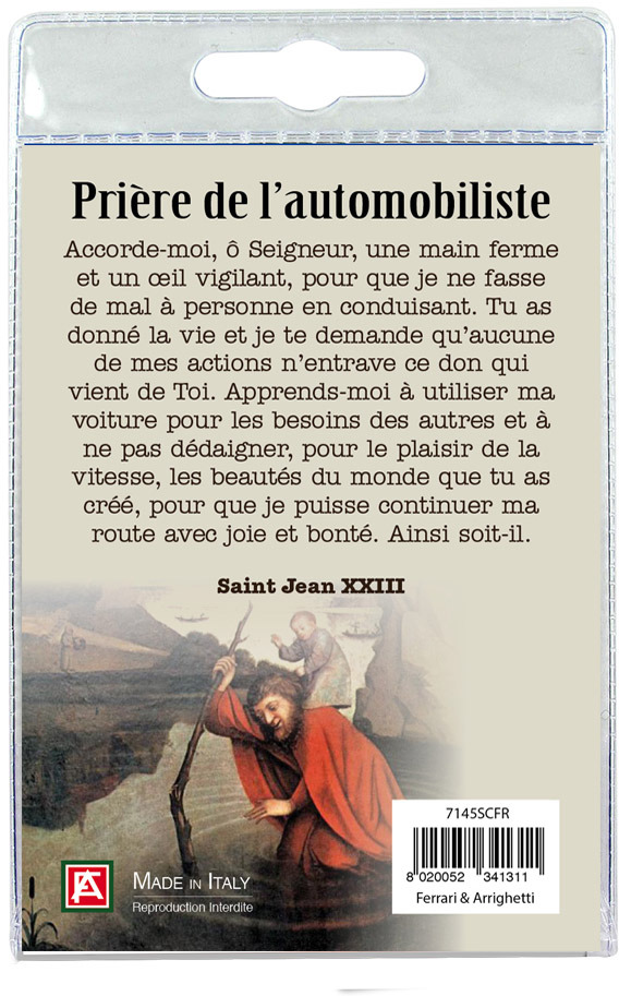 Calamita San Cristoforo in metallo nichelato con preghiera in francese