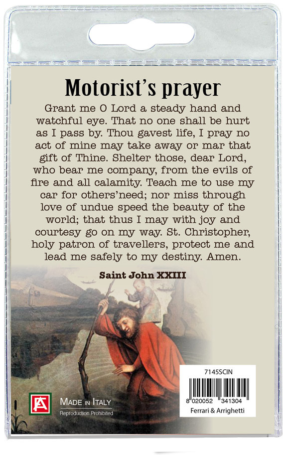 Calamita in metallo nichelato raffigurante San Cristoforo con preghiera in inglese.