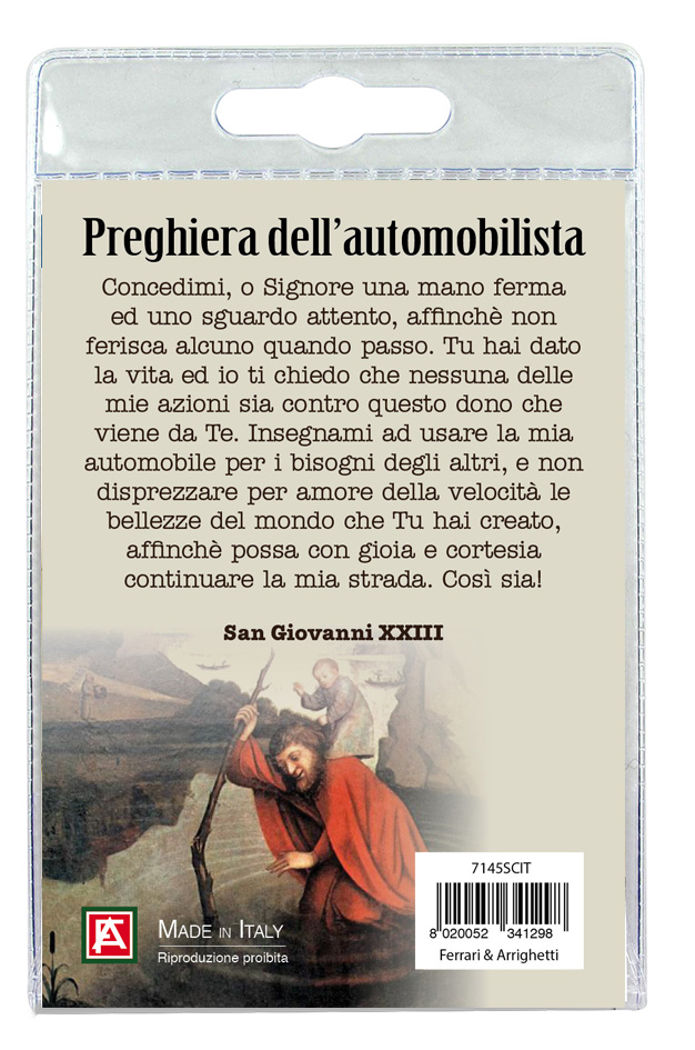 Nell'interno del blister c'è anche un cartoncino con l'immagine del Santo e sul retro del cartoncino stesso una preghiera dell'automobilista.