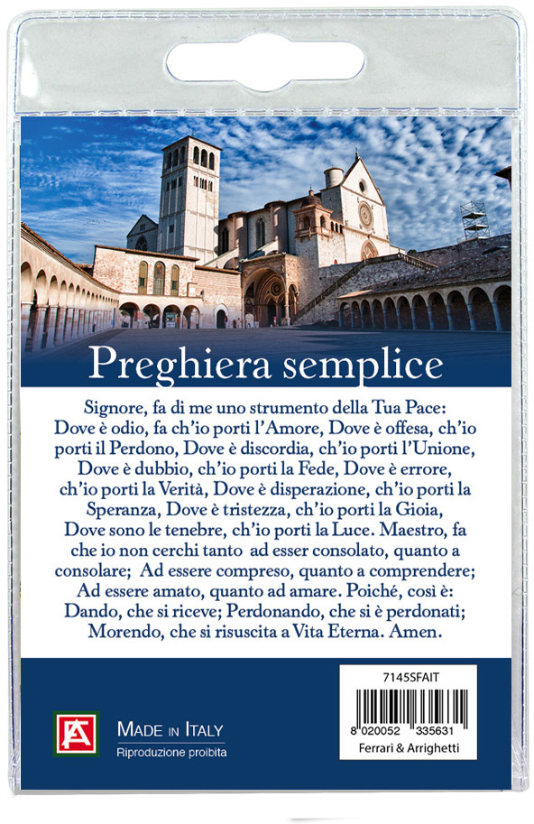 Nell'interno del blister c'è anche un cartoncino con l'immagine del Sant0 e sul retro del cartoncino stesso una preghiera a lui dedicata.
