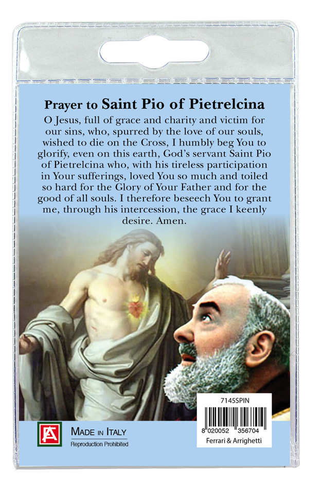 Nell'interno del blister c'è anche un cartoncino con l'immagine del Santo e sul retro del cartoncino stesso una preghiera a lui dedicata.