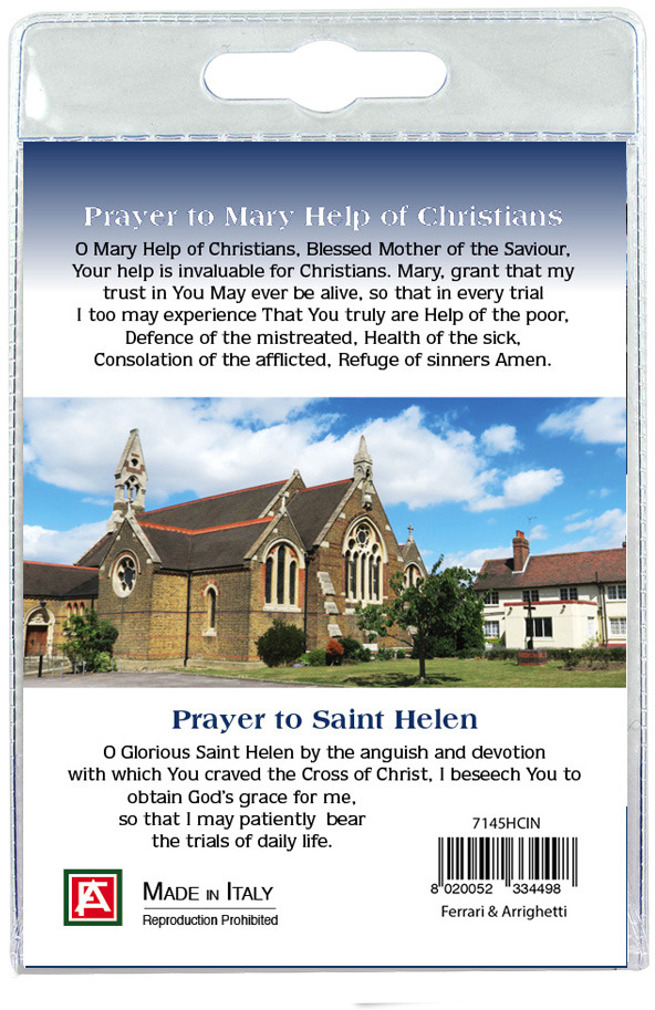 Calamita in metallo nichelato raffigurante Sant'Elena (St Helen) con preghiera in inglese.