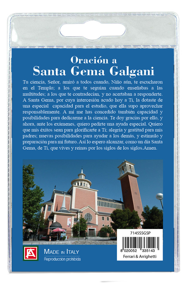 Nell'interno del blister c'è anche un cartoncino con l'immagine della Santa e sul retro del cartoncino stesso una preghiera a lei dedicata.