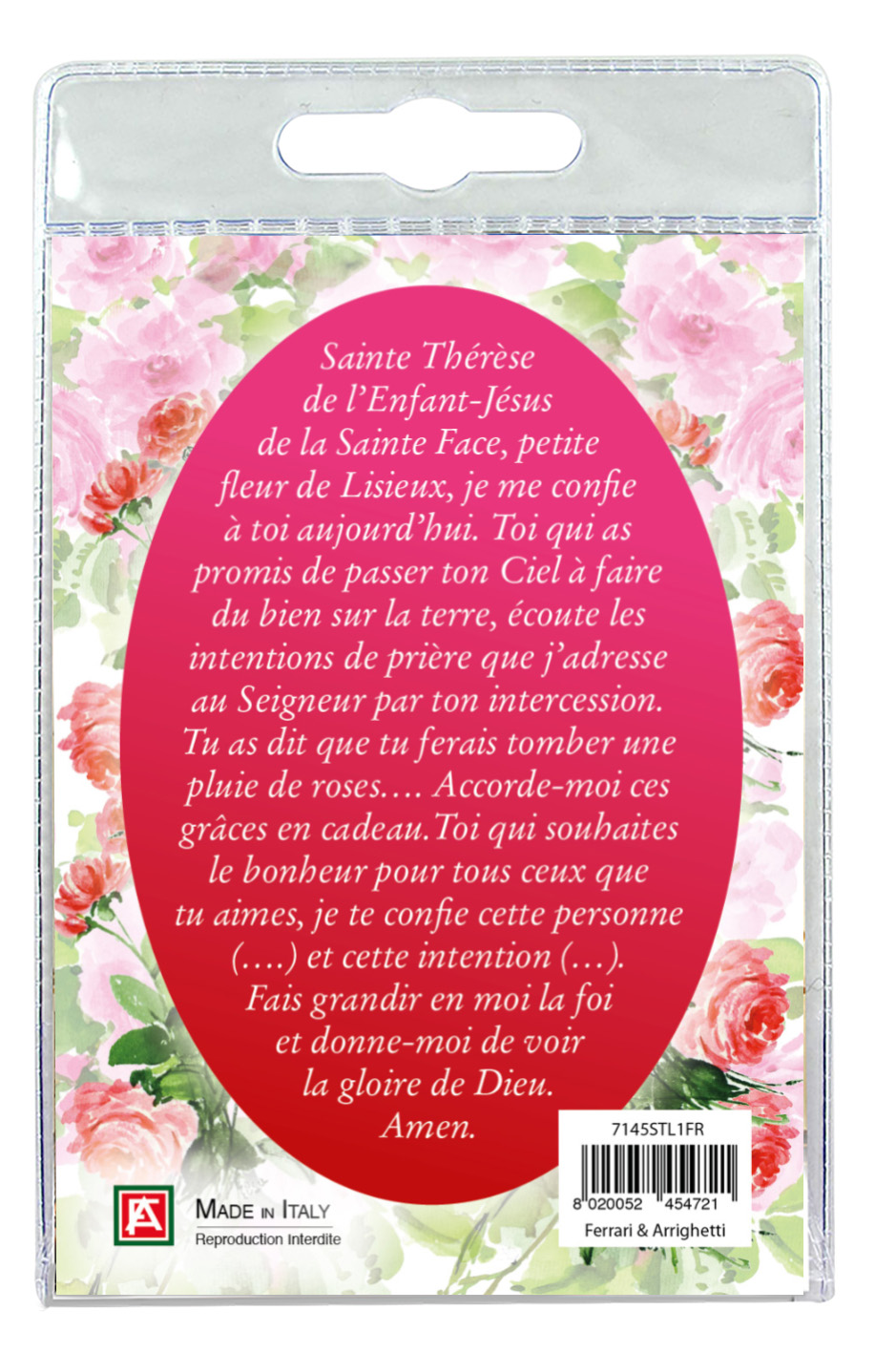 Calamita Santa Teresa di Lisieux in metallo nichelato con preghiera in francese