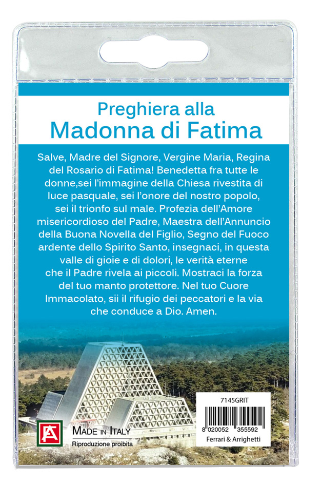 Nell'interno del blister c'è anche un cartoncino con l'immagine del Santuario e sul retro del cartoncino stesso una preghiera dedicata alla Madonna di Fatima.