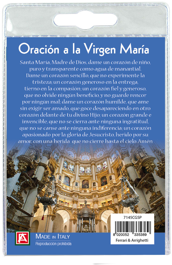 Nell'interno del blister c'è anche un cartoncino con l'immagine della Cattedrale di Granada e sul retro del cartoncino stesso una preghiera dedicata alla Vergine.