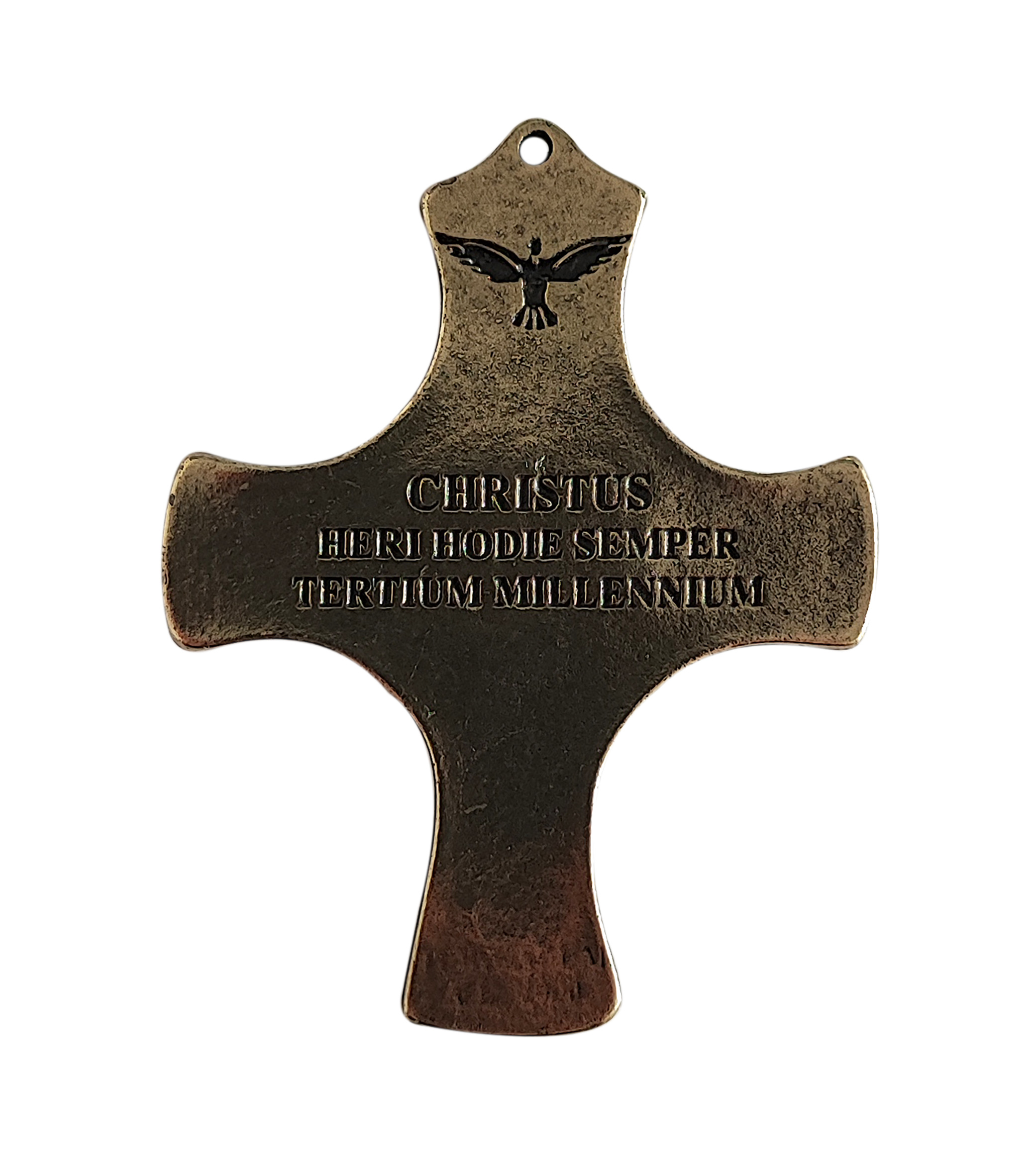 Croce in metallo bronzato raffigurante l'Agnus Dei, da 9 cm.