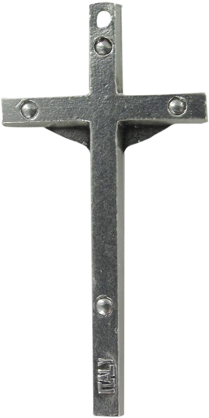 Croce in metallo nichelato con Cristo riportato di misura 4,8 x 2 cm.