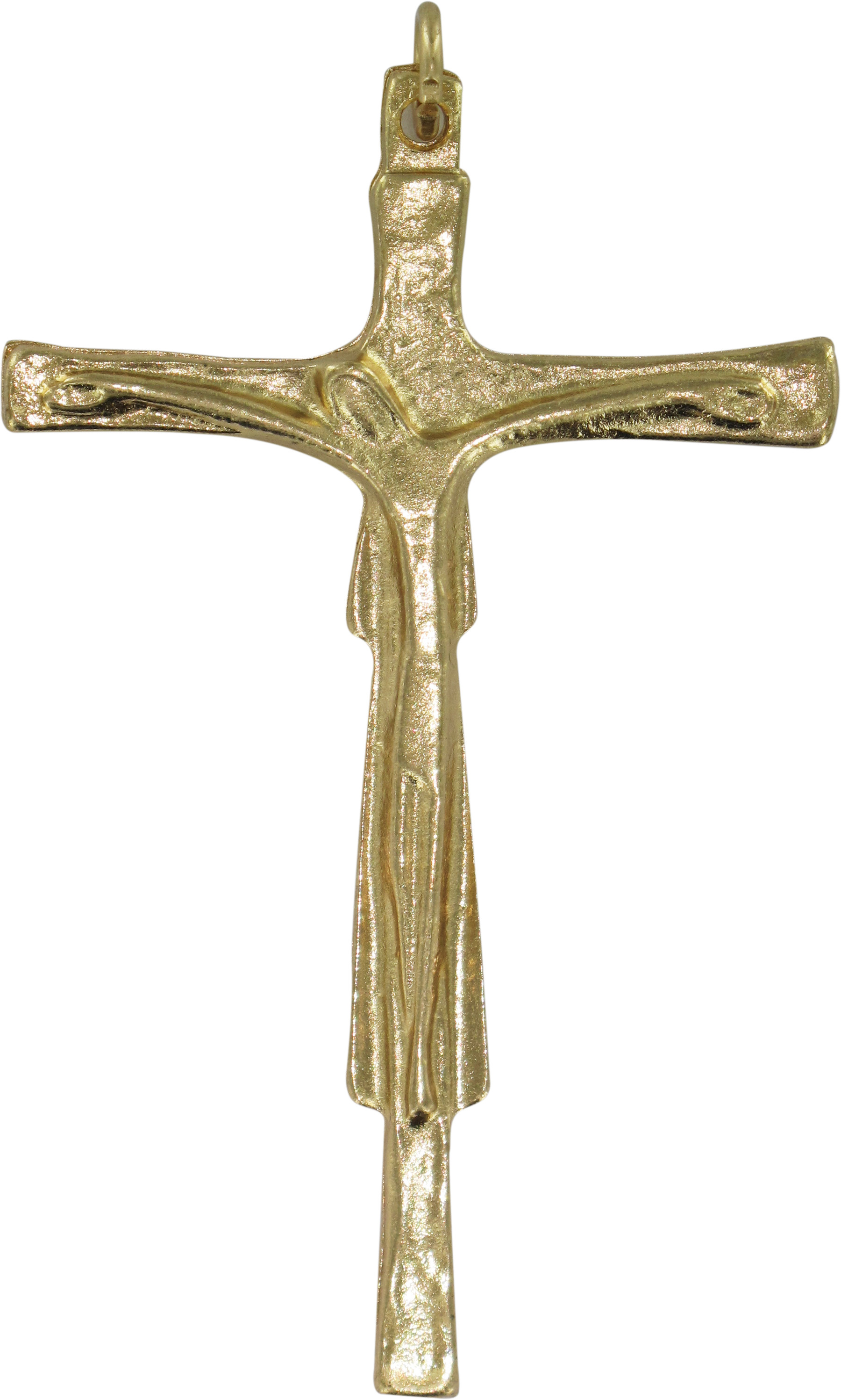 Croce dorata con raffiguranto da un lato Cristo in croce e dall'altro la Madonna di misura 8,5 x 5,5 cm.