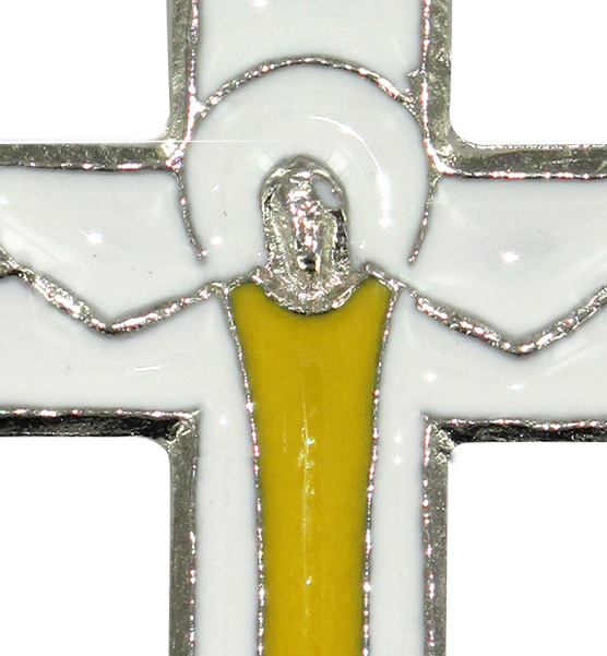 La croce è in metallo, rappresentante Gesù risorto , smaltata di colore bianco e giallo.