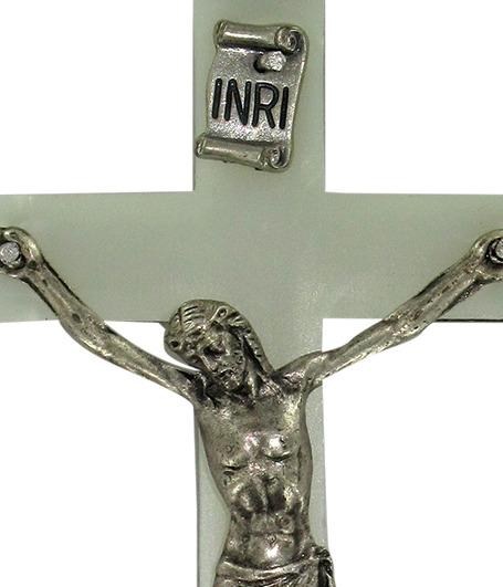 Croce fosforescente di cm. 5,5 con fondo in metallo nichelato.